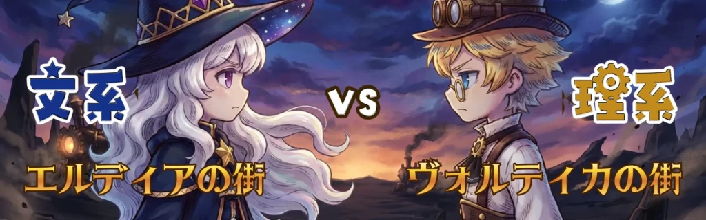 文系の街「エルディア」と理系の街「ヴォルティカ」。